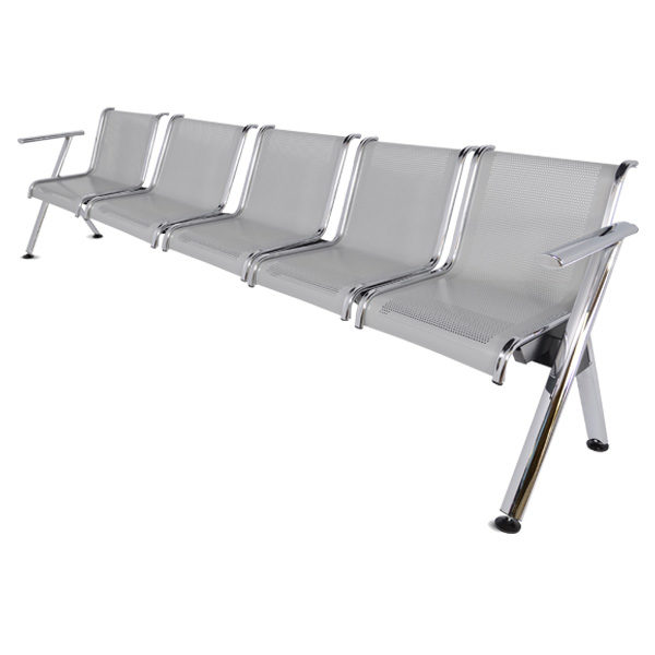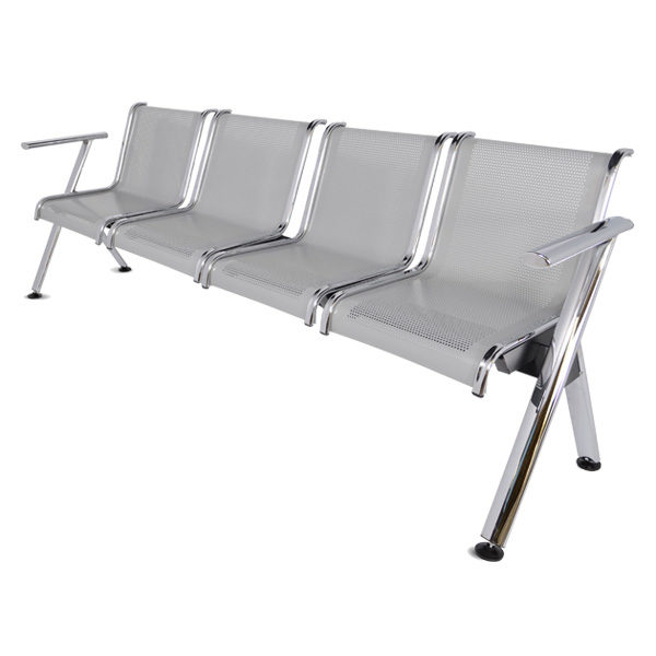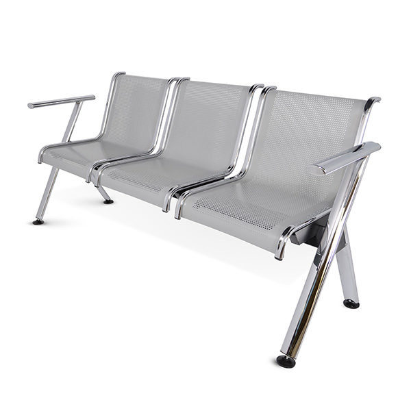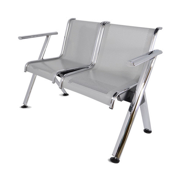 Brazos y patas fabricados con tubular ovalado de 2 1/2″ x 1 1/4″ con acabado en cromo, plazas en lámina multiperforada color gris con soportes en cada extremo de cada plaza cromados. Regatones niveladores en cada extremo de cada pata.