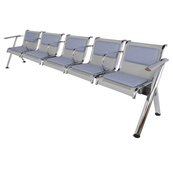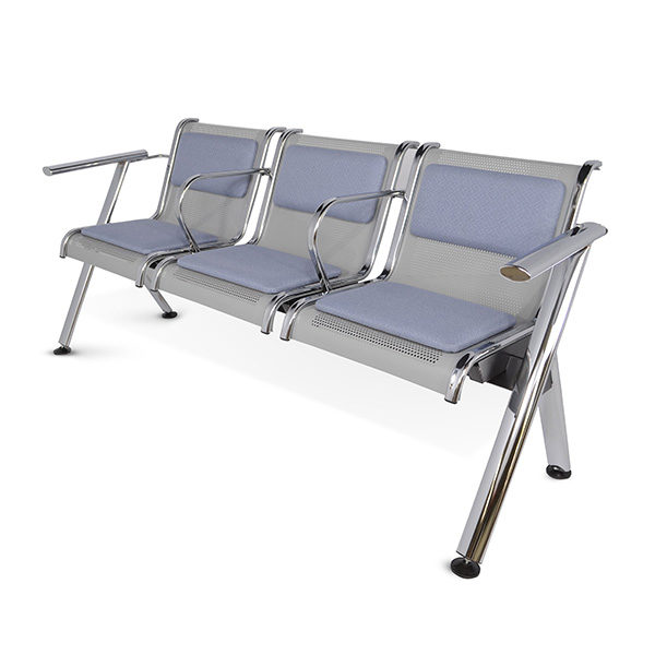 Brazos y patas fabricados con tubular ovalado de 2 1/2″ x 1 1/4″ con acabado en cromo, plazas en lámina multiperforada color gris con soportes en cada extremo de cada plaza cromados con brazos intermedios.
