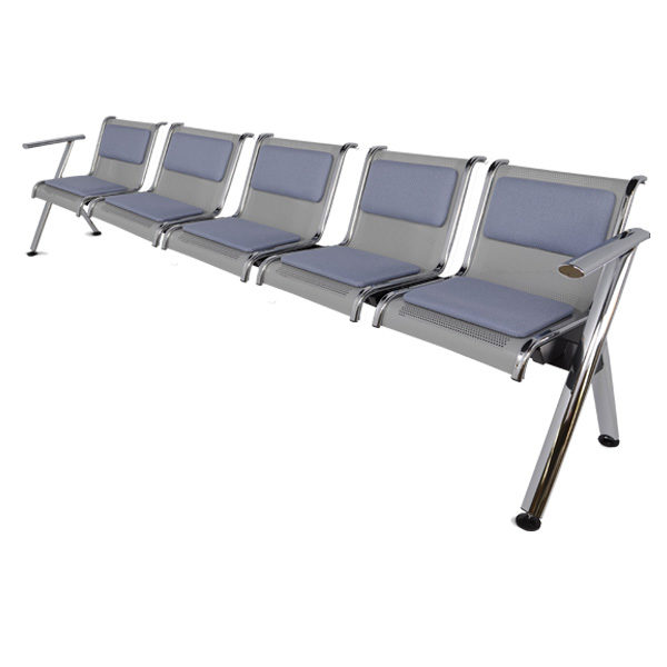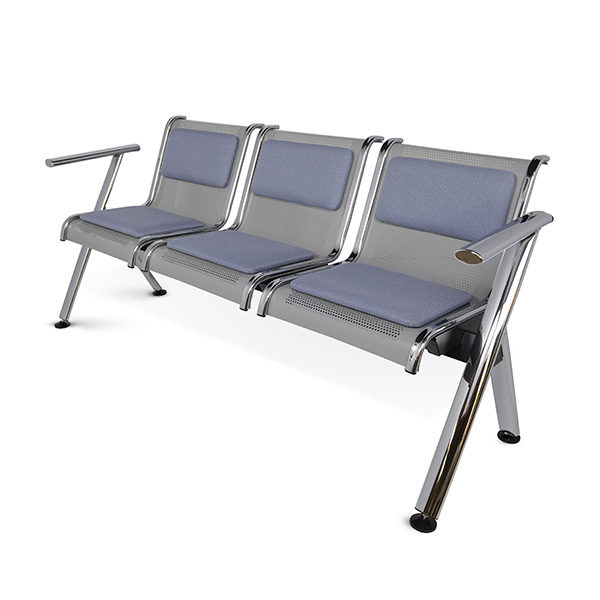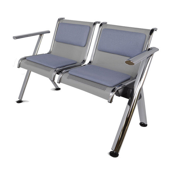 Brazos y patas fabricados con tubular ovalado de 2 1/2″ x 1 1/4″ con acabado en cromo, plazas en lámina multiperforada color gris con soportes en cada extremo de cada plaza cromados. Asiento y respaldo tapizados en tela color a elección de nuestro catálogo. Regatones niveladores en cada extremo de cada pata.