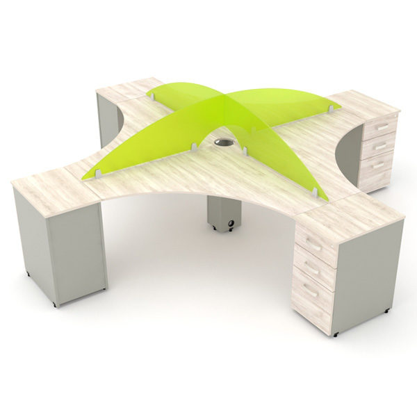 Cubiertas en melamina de 19 mm con acabado en los cantos en PVC de 1mm y mamparas divisorias en acrílico. Su base es un pedestal con dos cajones papeleros y un archivero.