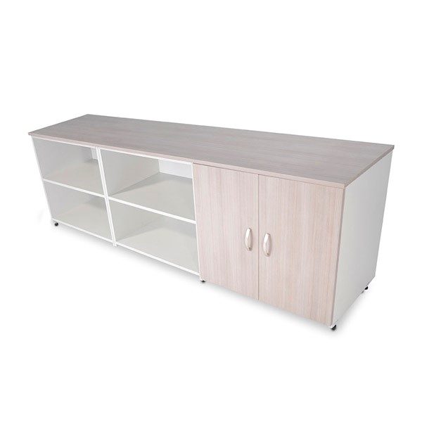 Credenza con 2 puertas, fabricada en melamina de 19 mm de espesor, cuenta con 3 entrepaños movibles, acabados en todos los cantos en PVC de 1 mm y niveladores.