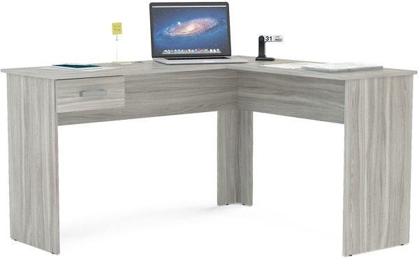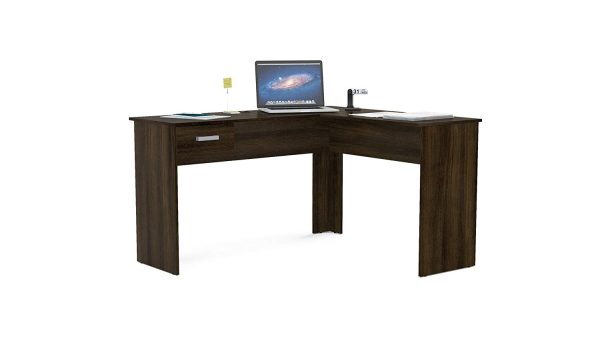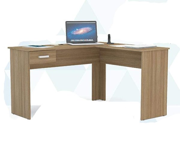 Escritorio en “L” fabricado en melamina con laminado plástico. Cuenta con un cajón papelero de amplio espacio, correderas sencillas y jaladera metálica. Desarmado para mejor manejo, incluye herrajes y manual de armado. ideal para home office o áreas pequeñas de trabajo. color: roble, encino, wengue. Medidas: frente 135cm x fondo 119cm, altura 75cm.