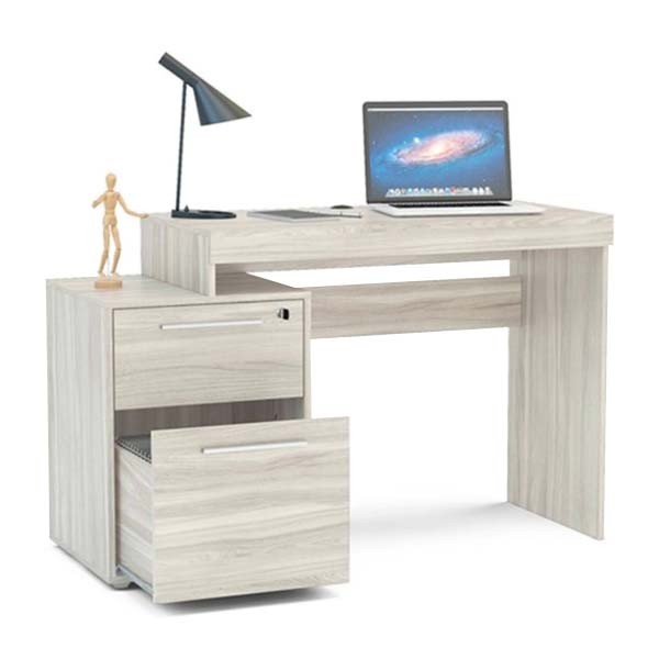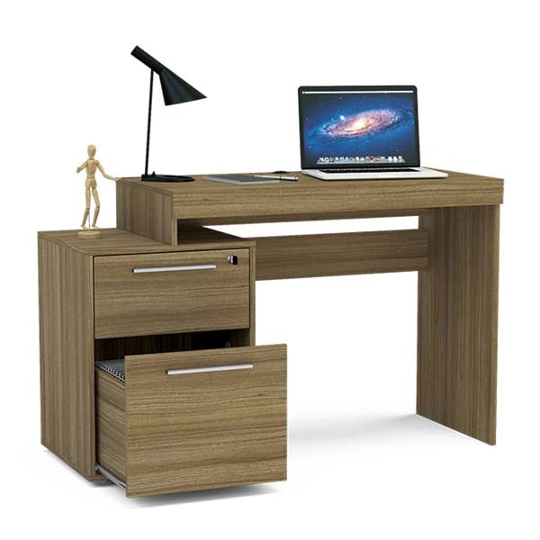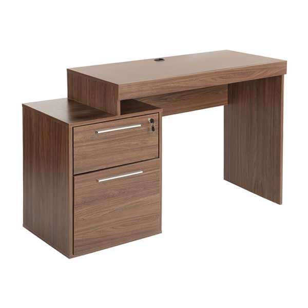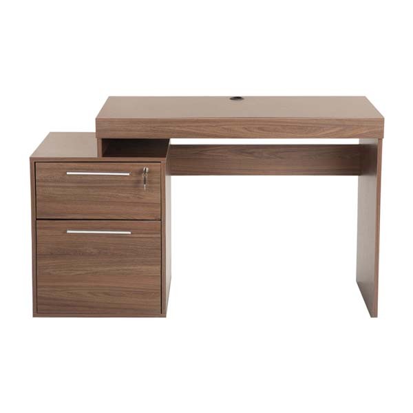 Escritorio recto fabricado en melamina con laminado plástico. Cuenta con dos cajones de amplio espacio, correderas sencillas y jaladeras metálicas. Desarmado para mejor manejo, incluye herrajes y manual de armado. Ideal para home office o áreas pequeñas de trabajo. Color: roble, nogal, encino. Medidas: frente 120cm x fondo 46cm, altura 75cm.