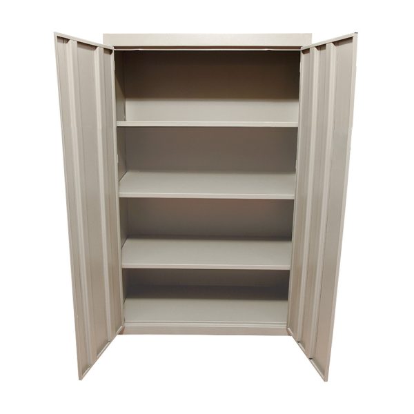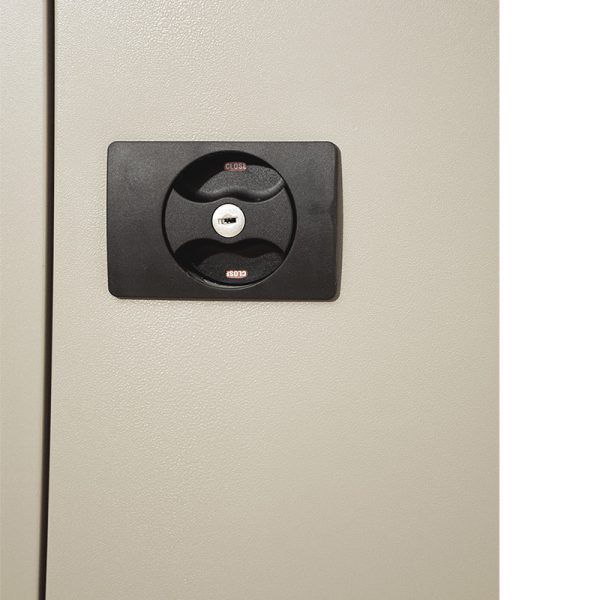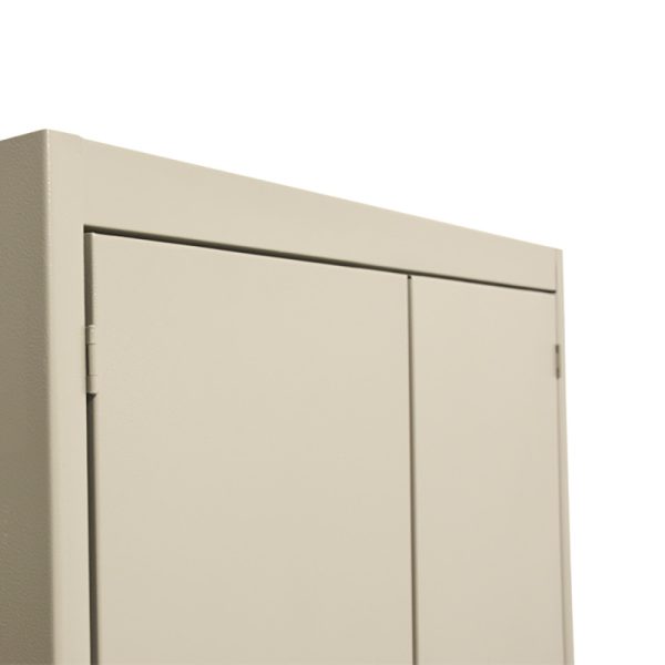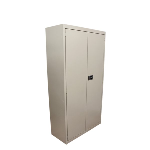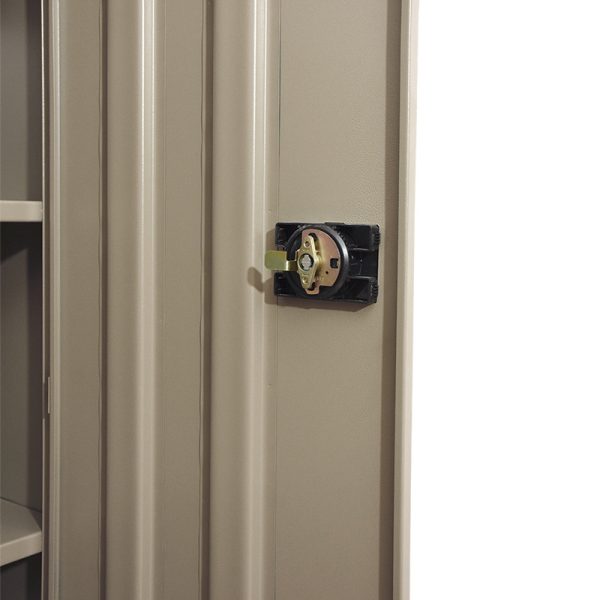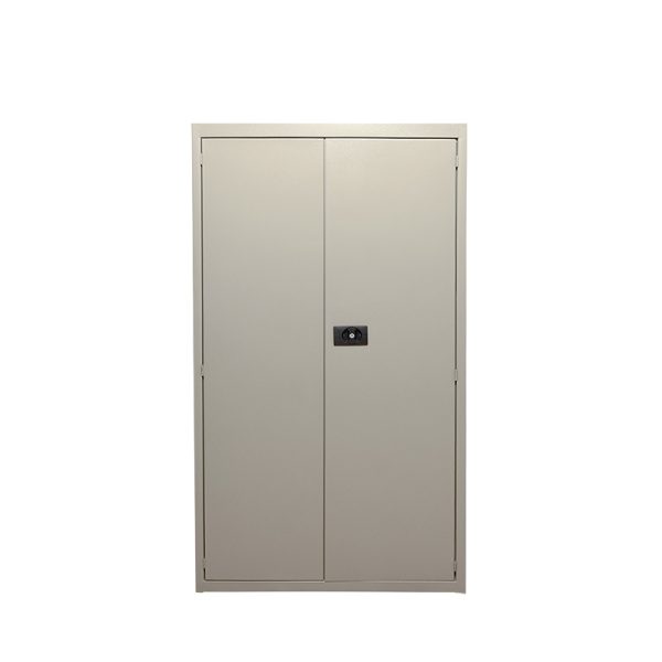 Dos puertas abatibles, las puertas de los gabinetes se abren y cierran por medio de tres bisagras, cada puerta cuenta con 2 refuerzos verticales. Una puerta lleva su cerradura empotrada fabricada en plásticos ABS tipo paleta, incluye dos llaves y su estiradera. Color gris o arena.