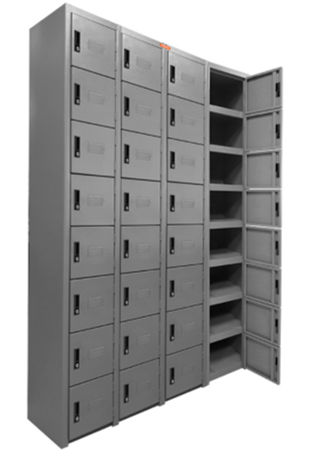 LOCKER CON 32 COMPARTIMENTOS. FABRICADO EN LAMINA DE ACERO CALIBRE: 24 ROLADA EN FRIO. SOLDADURA POR RESISTENCIA. ZOCLO DE 6CM AL MARGEN DEL PISO, PARA DEJAR CIRCULAR EL AGUA Y NO DAÑE LA BASE. CERRADURA TIPO PALETA CON JALADERA. ACABADO EN PINTURA DE POLVO APLICADA ELECTROSTATICAMENTE Y TERMO-ENDURECIDA A 200°. COLOR: GRIS O ARENA. MEDIDAS: FRENTE 120CM X FONDO 30CM X ALTURA 181CM.