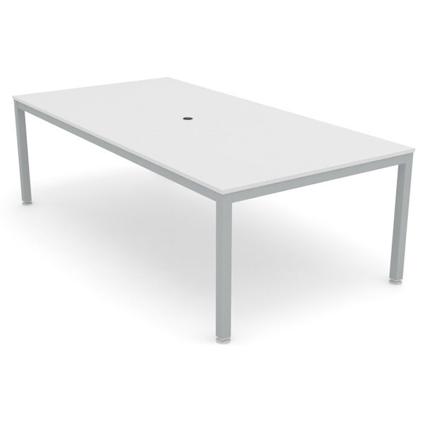 Cubierta rectangular fabricada en melamina de 19 mm con acabado en los cantos en PVC de 1 mm. Marco y base fabricada en acero cuadrado de 2″ con acabado en pintura electrostatica color gris y niveladores.