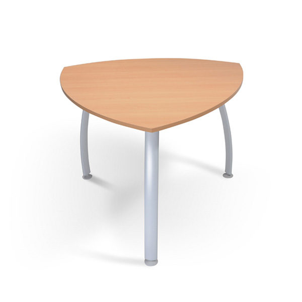 Consta de cubierta tipo triangular fabricada en melamina de 19 mm de espesor con acabado en los cantos en PVC de 1 mm. Base de 3 patas fabricadas en acero ovalado con acabado en pintura electrostática color gris.