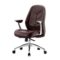 Base estrella de 5 puntas en fundición de aluminio con rodajas tipo dual. Elevación por medio de pistón neumático que permite ajustar la altura del asiento. Mecanismo tipo articulado synchro con anti-shock con palanca de bloqueo, perilla de regulación de tensión para el sistema de reclinación. Brazos de aluminio fundido, acojinados y tapizados en soft revolving leather color chocolate. Asiento y respaldo bajo acojinados en hule espuma densidad de 50 kg/m3 y tapizados en soft revolving leather de color chocolate.