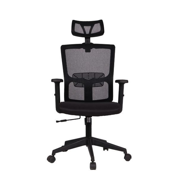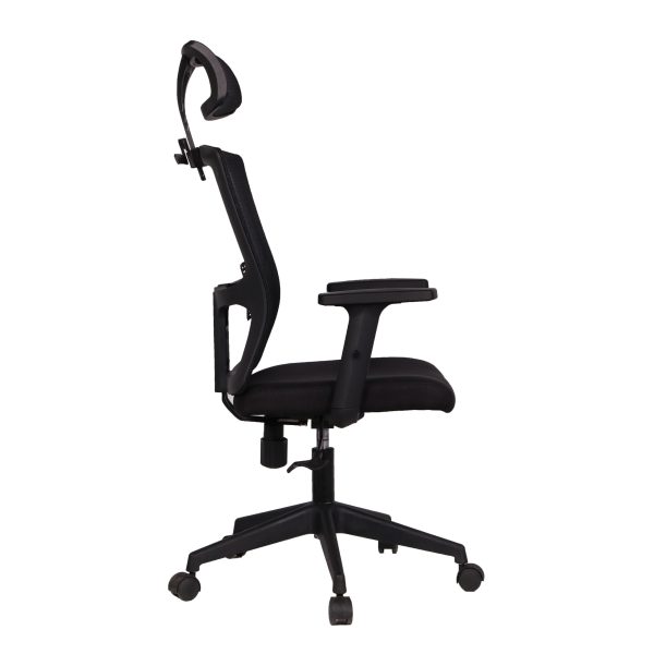 Brazo de polipropileno con ajuste de altura y pad de poliuretano inyectado, respaldo de malla de poliéster, respaldo con cabecera, soporte lumbar y porta saco, asiento grande de hule espuma de 24kg/m3, tapizado en tela import color negro. base spider de nylon de 25″. Mecanismo: palanca para ajustar altura y bloqueo de reclinamiento, perilla para ajustar la tensión del reclinamiento