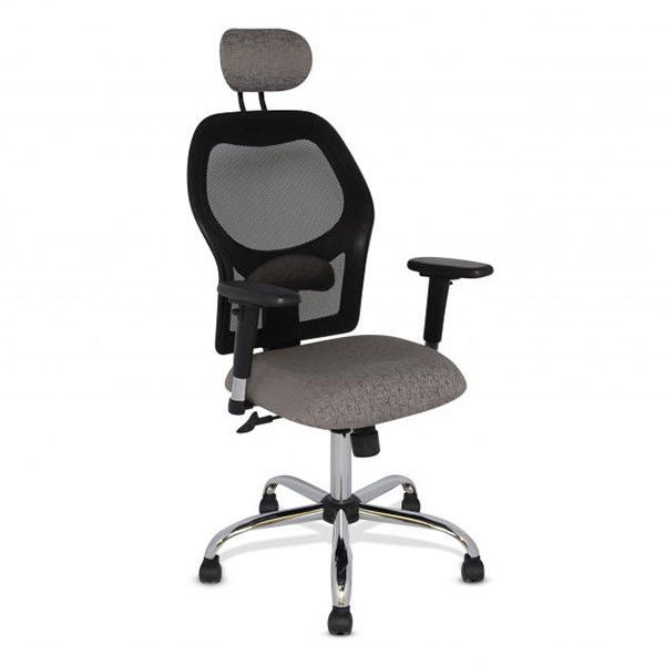 Brazo de acero cromado, ajustable en tres dimensiones (x,y,z) y poliuretano inyectado. Asiento extra grande acojinado con poliuretano inyectado moldeado ergonómicamente, respaldo con cabecera y soporte lumbar ajustable en altura. Con base cromada de 27” y pistón cromado. Respaldo en malla, asiento y cabecera tapizado en tela color a elección de nuestro catálogo.