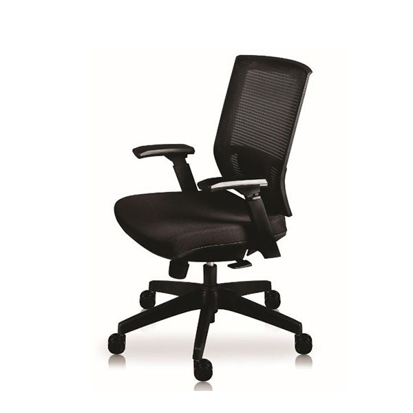 Respaldo tapizado con malla, con almohadilla lumbar ajustable. Asiento tapizado en tela crepe con espuma de poliuretano inyectado de 5 cm de espesor x 50 kg/m3 de densidad. Brazos con ajuste de altura y codera en poliuretano suave deslizantes. Base pentagonal y rodajas de nylon de 60 mm.