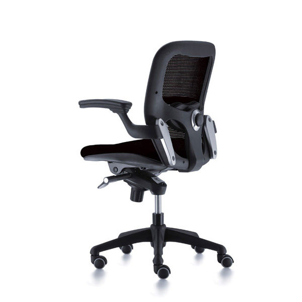 Brazos sujetos al asiento, con ajuste de altura y medio giro a los costados (interno y externo). Base de nylon de 27″con rodaja de PU de 50 mm. Mecanismo de rodilla, 5 posiciones y pistón rebasador de base, pistón ejecutivo. Perilla de asiento tensora de reclinamiento. Color negro.