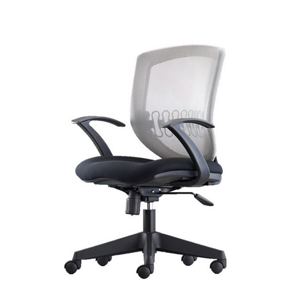 Estructura y soporte lumbar flexible de polipropileno, tapizado en malla gris. Asiento tapizado en tela negra con espuma de poliuretano inyectado de 480 mm de espesor. Base de nylon de 26″ y rodajas de nylon 50 mm.