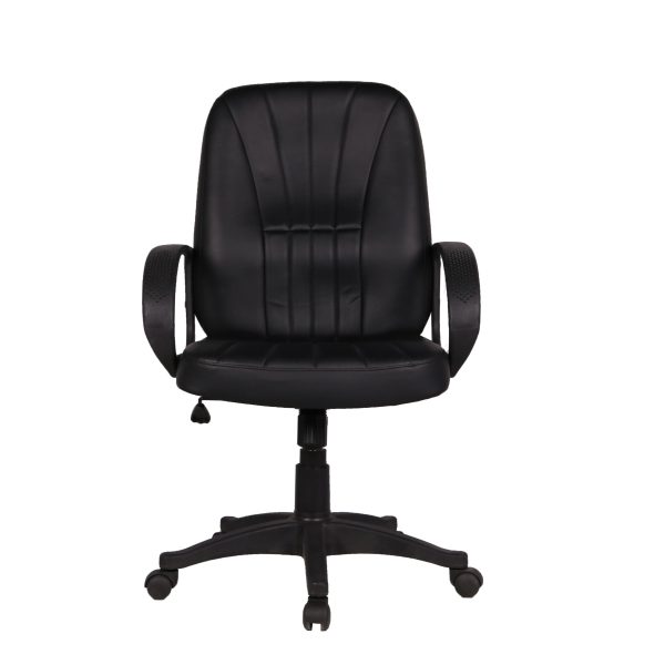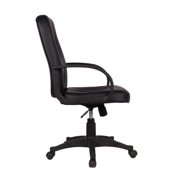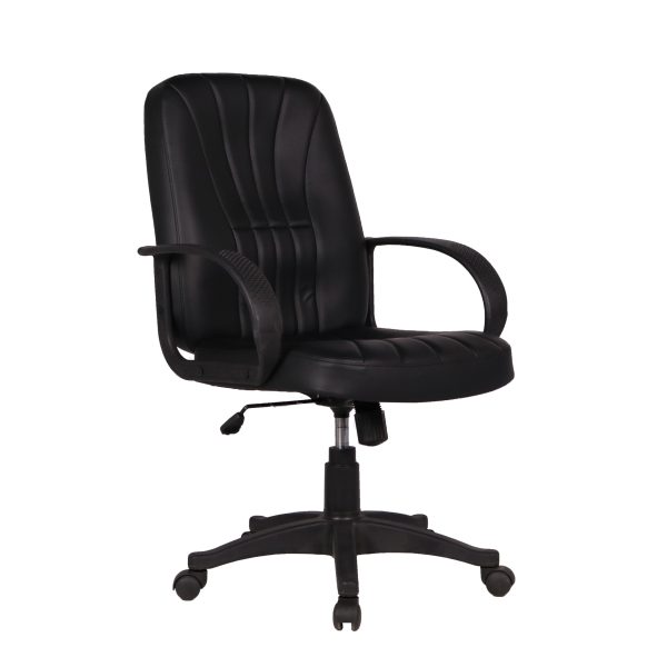 Brazo de polipropileno fijo, respaldo y asiento tapizados en tacto-piel, acojinado con hule espuma de 24kg/m3 base de nylon de 24″. Mecanismo: palanca para ajustar altura y bloqueo de reclinamiento, perilla para ajustar la tensión del reclinamiento. Color negro