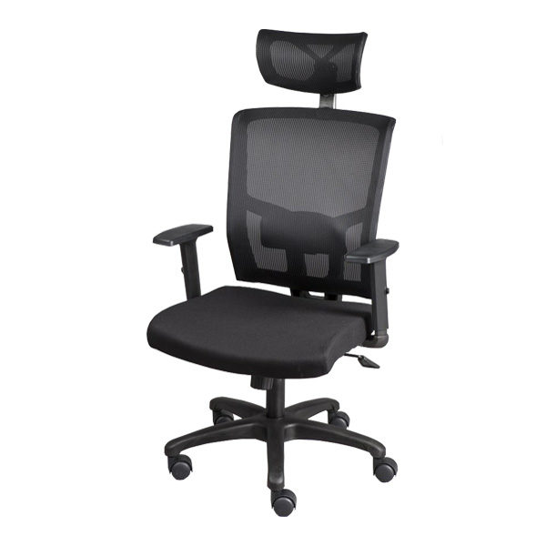 Respaldo tapizado en malla con almohadilla lumbar ajustable de altura. Cabecera tapizada en malla, ajustable en altura y mecanismo rotable. Asiento de espuma estándar tapizado en tela.