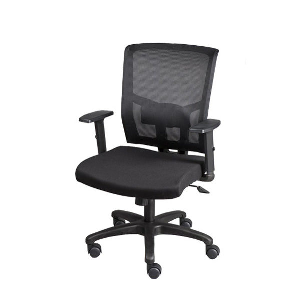 Respaldo tapizado en malla con almohadilla lumbar ajustable de altura. Asiento de espuma estándar tapizado en tela. Brazos de polipropileno ajustable en altura con Pad de polipropileno.