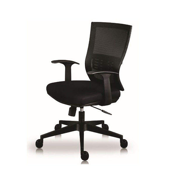 Brazos fijos de polipropileno en forma de T, sujetos al asiento. Base de nylon de 26″con rodaja de nylon de 60 mm. Mecanismo ejecutivo, con palanca para activar pistón y bloqueo de reclinamiento, pistón ejecutivo. Perilla de asiento tensora de reclinamiento. Color negro.
