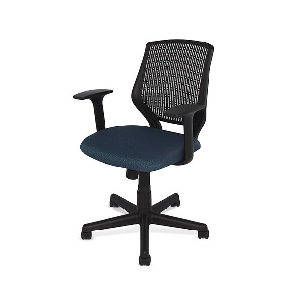 Respaldo de polipropileno con malla mesh y asiento acojinado en hule espuma de poliuretano flexible de 24 kg/m³, tapizado en tela poliéster color a elección de nuestro catálogo.