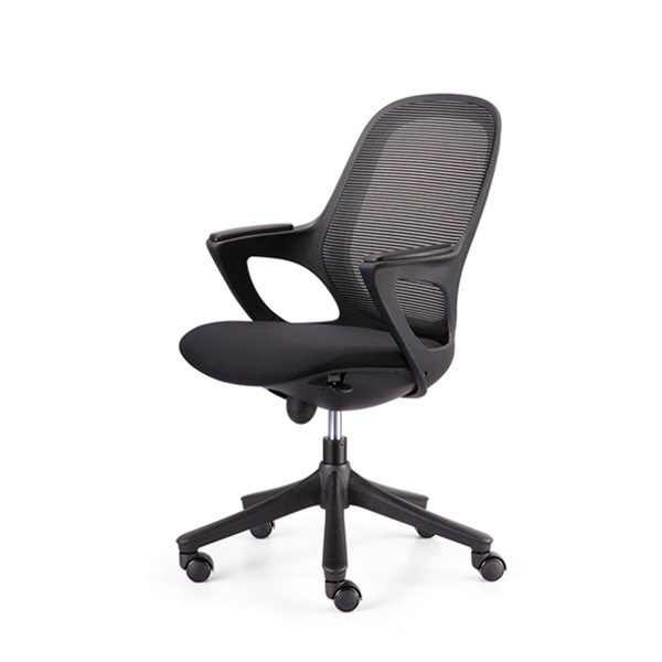 Brazos polipropileno fijos a la estructura del respaldo. Base de nylon de 26″con rodajas PU de 50 mm, mecanismo ejecutivo con activación de ajuste de altura y bloqueo de reclinamiento, pistón ejecutivo. Perilla de asiento tensora de reclinamiento. Color negro.
