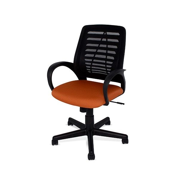 Base de estrella de 5 puntas de nylon de 26". Brazos de polipropileno. Mecanismo con ajuste de profundidad y altura. Respaldo con malla mesh y asiento acojinado en hule espuma de poliuretano flexible de 24 kg/m³, tapizado en tela poliéster color a elección de nuestro catálogo.