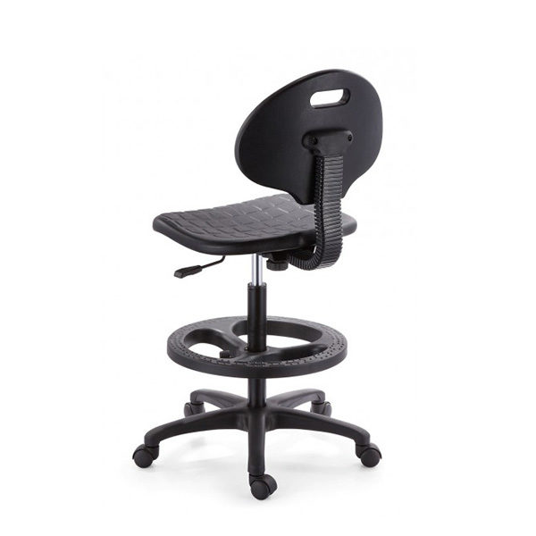 Acojinado con poliuretano compacto suave de uso industrial con interior en madera de triplay, mecanismo fijo con palanca para activación de pistón. Pistón cajero con aro de nylon, base de nylon pentagonal de 24" con rodajas en nylon de 50mm.