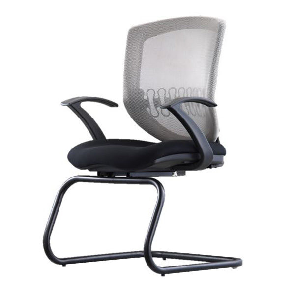 Estructura y soporte lumbar flexible de polipropileno, tapizado en malla gris. Asiento tapizado en tela negra con espuma de poliuretano inyectado de 480 mm de espesor. Patín de tubular redondo calibre 14 acabado color negro. Brazos de polipropileno sujetos al asiento.