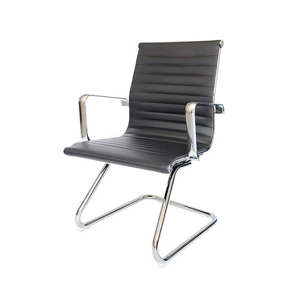 Base trineo de acero tubular redondo de 1″ de diámetro cal. 14, con terminado en cromo. Asiento y respaldo bajo de un sólo corte tensado con la estructura y tapizado en soft revolving leather acojinado con hule espuma laminada flexible; toda la estructura es de acero tubular con terminado en cromo.